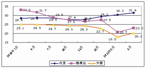当前值得关注的问题:一是企业亏损面依然较大,前2个月亏损企业3907个,亏损面达到26.7%,亏损企业亏损额同比增长49.4%。二是企业成本上升较快,前2个月全行业主营业务成本8790亿元,同比增长24%,成本收入比高达89.3%。三是企业库存明显增长,前2个月全行业产成品存货1844亿元,同比增长24.7%,占收入比重接近20%。近期,国内外形势不确定因素很多,日本地震影响正逐步显现,要加强形势监测,及时采取措施保障行业平稳发展。
