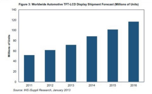 据IHSiSuppli公司的移动与新兴显示器与技术服务,由于越来越多地使用在中档及经济型汽车之中,2012-2016年车载汽车显示器出货量将增长近一倍。部分原因在于美国要求汽车使用后视摄像头。
