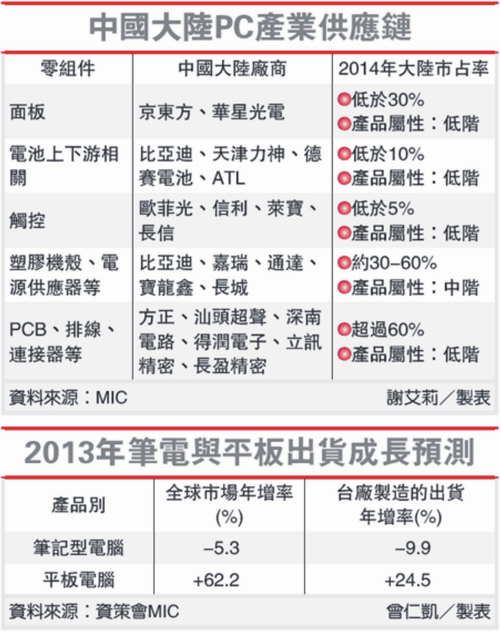 据台湾资讯工业策进会(MIC)调查分析,我国大陆PC产业供应链中各厂商及市占率、水平如下: