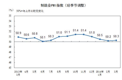 据国家统计局发布的2014年3月中国制造业采购经理指数(PMI),为50.3%,比上月微升0.1个百分点,是自去年11月份后首次回升,预示我国制造业总体平稳向好。采购经理指数(PMI),是通过对企业采购经理的月度调查结果统计汇总、编制而成的指数,它涵盖了企业采购、生产、流通等各个环节,是国际上通用的监测宏观经济走势的先行性指数之一,具有较强的预测、预警作用。PMI通常以50%作为经济强弱的分界点,PMI高于50%时,反映制造业经济扩张;低于50%,则反映制造业经济收缩。